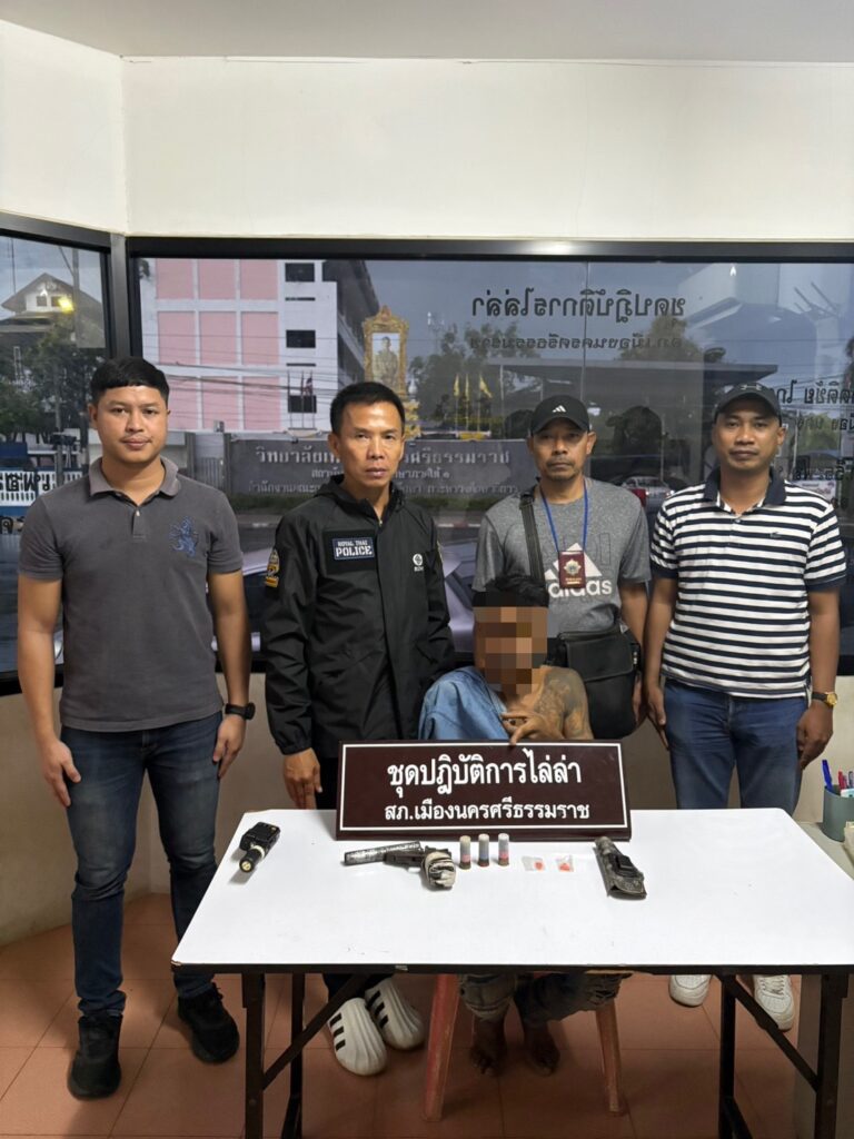 จึงนำกำลังไปสังเกตุการณ์ตรวจสอบ ถ.ยมราช ต.คลัง อ.เมือง จ.นครศรีธรรมราช สามารถจับกุมชายฉกรรจ์เป้าหมายดังกล่าวได้โดยละม่อมคาบ้านพักในย่านถนนยมราช ต.คลัง อ.เมือง จ.นครศรีธรรมราช ทราบชื่อนายอนันต์ หรือ “เล็ก ยมราช” อายุ 32 ปี มีพร้อมของกลาง 1.อาวุธปืนพกสั้นไทยประดิษฐ์ ความยาวลำกล้อง 5 นิ้ว จำนวน 1 กระบอก 2.กระสุนปืนลูกซอง เบอร์ 12 จำนวน 3 นัด 3.ยาเสพติดให้โทษประเภทที่ 1 (ยาบ้า) ชนิดเม็ดสีส้ม กลมแบน ประทับอักษร WY จำนวน 15 เม็ด 4.ซองหนังสำหรับพกใน ลายขาวดำ จำนวน 1 ซองและ 5.หนังสือรับรองผลการตรวจปัสสาวะของโรงพยาบาลมหาราชนครศรีธรรมราช จึงควบคุมตัวนำส่งพนักงานสอบสวน สภ.เมใือง จ.นครศรีธรรมราช ดำเนินคดีตามกฎหมาย