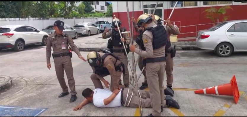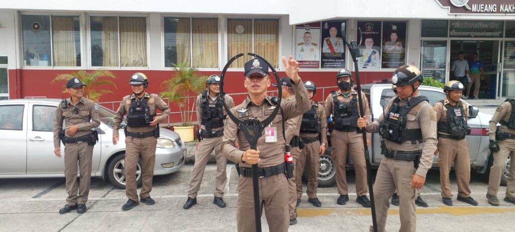 ผู้การฯเมืองคอนฝึกสายตรวจเมืองคอนใช้เหล็กง่ามไฟฟ้าปราบคนเชือนคุ้มคลั่งยานรก