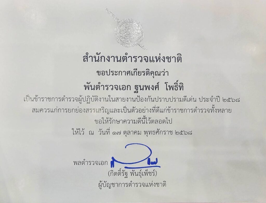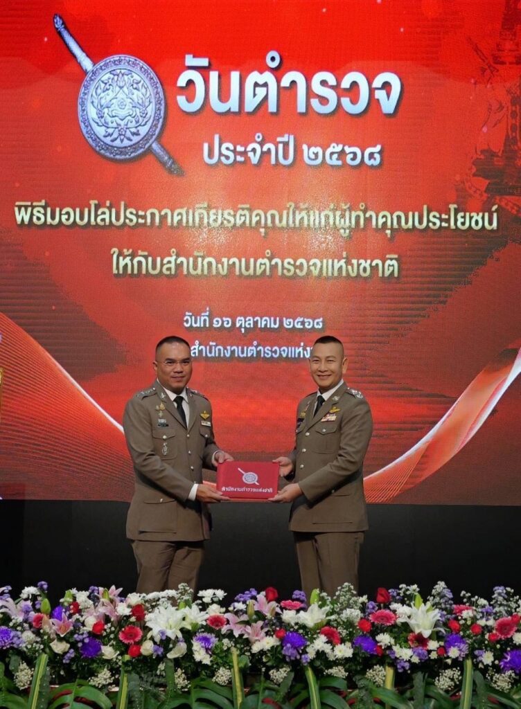 เมื่อวันที่ 16 ตุลาคม ที่ห้องประชุมศรียานนท์ ชั้น 2 อาคาร 1 ตร. พล.ต.อ.กิตติ์รัฐ พันธุ์เพ็ชร์ ผบ.ตร. ได้มอบโล่ประกาศเกียรติคุณให้แก่ผู้ทำคุณประโยชน์ให้กับตำรวจ ในด้านข้าราชการตำรวจที่ปฏิบัติหน้าที่สายงานป้องกันปราบปรามดีเด่น ประจำปี 2568 อันดับที่ 1 ระดับผู้กำกับการ โดยมีผู้ได้รับรางวัลคือ พ.ต.อ.ฐนพงศ์ โพธิ์ทิ ผกก.สภ.เสม็ด อ.เมือง จ.ชลบุรี