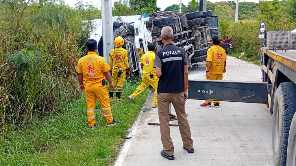 เมื่อเวลา 10.00 น. วันที่ 17 พฤศจิกายน 2568 ศูนย์วิทยุ เพียวเยี่ยงไทยศรีราชา ได้รับแจ้งเหตุ ได้รับแจ้งมีอุบัติเหตุรถพ่วงหกล้อเบรกแตก แหกโค้งพุ่งชนรถประชาชนเสียหายและคันคนขับ ติดภายใน บริเวณเส้นหลังนิคมปิ่นทองสี่มุ่งหน้านิคมปิ่นทองสาม หมู่ 4 ตำบลบึง อำเภอศรีราชาจังหวัดชลบุรีหลังรับแจ้งจึงรีบเดินทางไปตรวจสอบในที่เกิดเหตุพร้อมด้วยเจ้าที่หน่วยกู้ภัยเพียวเยี้ยงไท้ ศรีราชา