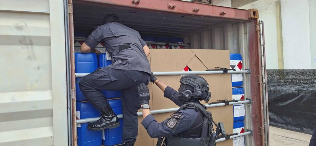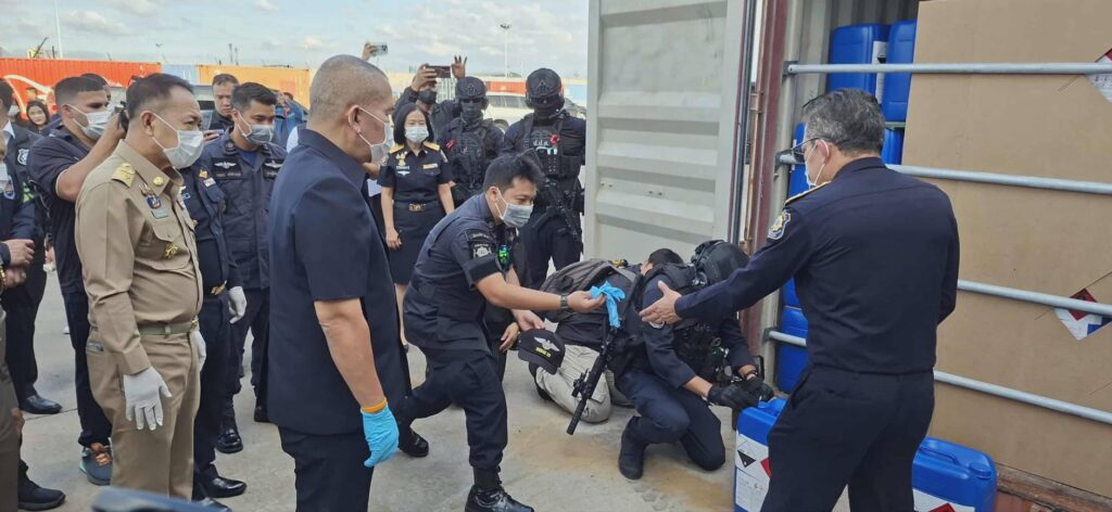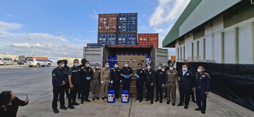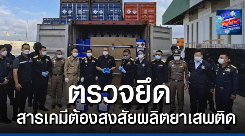 ปปส.ร่วมกับศุลกากรท่าเรือแหลมฉบังและหน่วยงานที่เกี่ยวข้องปฏิบัติการตรวจยึดสารเคมีต้องสงสัยที่นำไปใช้ในการผลิตยาเสพติด ณ ท่าเกรือแหลมฉบัง จังหวัดชลบุรี