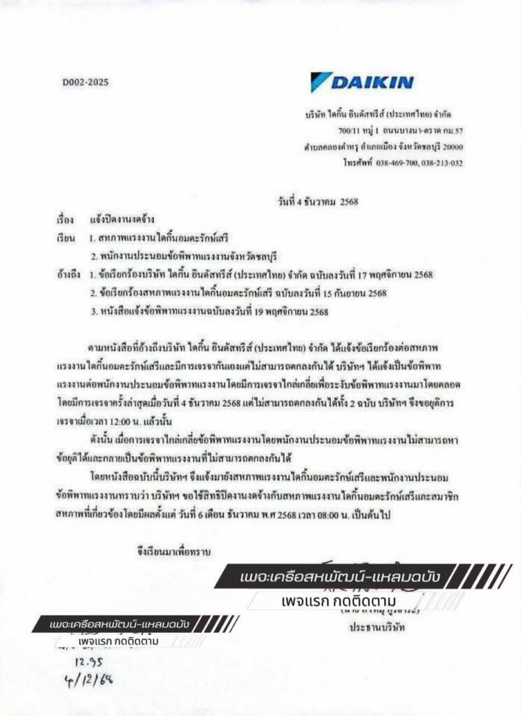 บริษัทฯ ขอใช้สิทธิปิดงานงดจ้างกับสหภาพแรงงานไดกิ้นอมตะรักษ์เสรี และสมาชิกสหภาพที่เกี่ยวข้อง โดยมีผลตั้งแต่วันที่ 6 เดือนธันวาคม พ.ศ 2568 เวลา 08.00 น. เป็นต้นไป