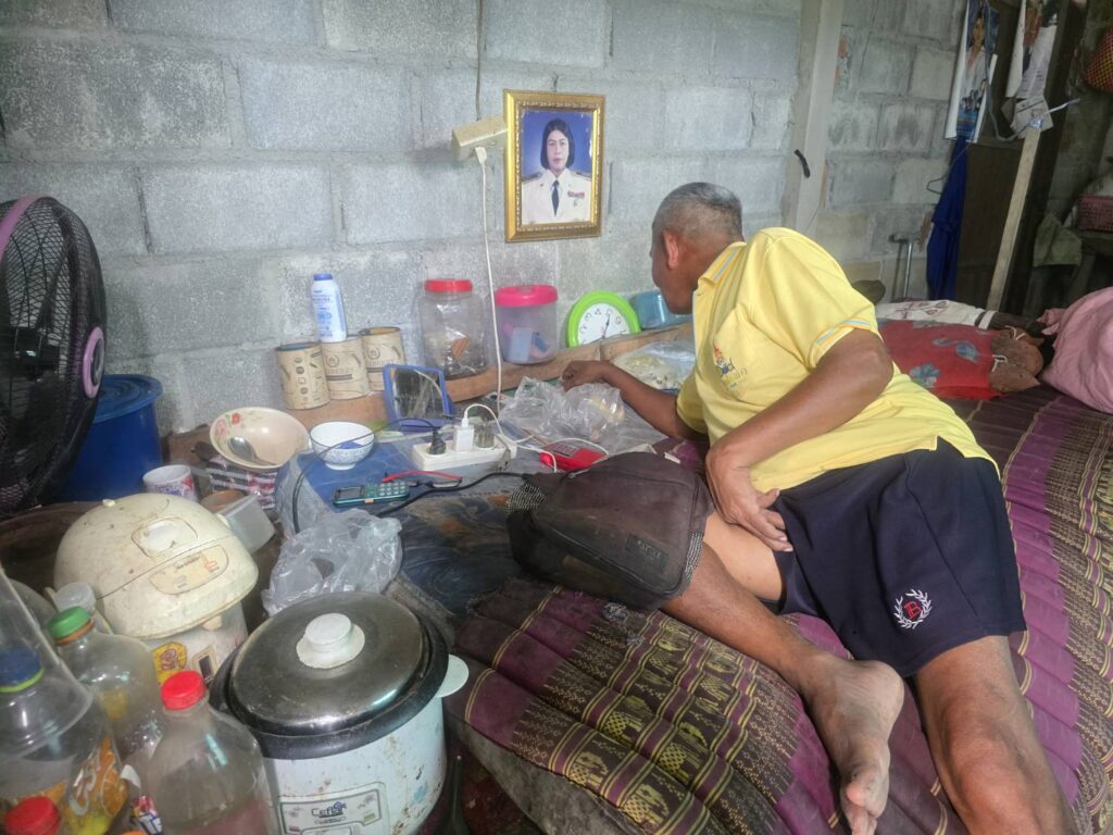 จากการตรวจสอบพบว่าบ้านที่สร้างแบบง่าย ๆ ขนาดกว้าง 3X6 เมตร ภายในบ้านมีเตียงไม้เก่า ๆ ชำรุด และข้างของวางรวมกัน ถัดไปภายในบ้านมีโถส้วมลอยโดยไม่มีฝานังกั้นใด ๆ ข้างเตียงนอน มีภาพถ่ายภรรยา อดีตข้าราชการระดับหัวหน้างาน อบจ.นครศรีธรรมราช ซึ่งเสียชีวิตไปเกือบ 10 ปีแล้วแขวนอยู่ สภาพรอบบ้าน รอบบ้านมีต้นไผ่ ป่าละเมาะรกทึบสุ่มเสี่ยงที่สัตว์ร้าย งูเหลือม งูพิษ ตะขาบเข้ามาทำอันตรายถึงในบ้าน และมียุงชุกชุม เพราะยังมีน้ำท่วมขังอยู่รอบบ้าน มีเตียงเก่าไม้สักสภาพยังแข็งแรงที่เพื่อนในอดีตบริจาคให้มานานแล้ว แต่วางไว้ใต้พุ่มต้นไผ่ให้น้องหมาขึ้นนอนหนีน้้ำ เพราะไม่มีคนช่วยยกเปลี่ยนมาเป็นเตียงนอนในบ้าน”