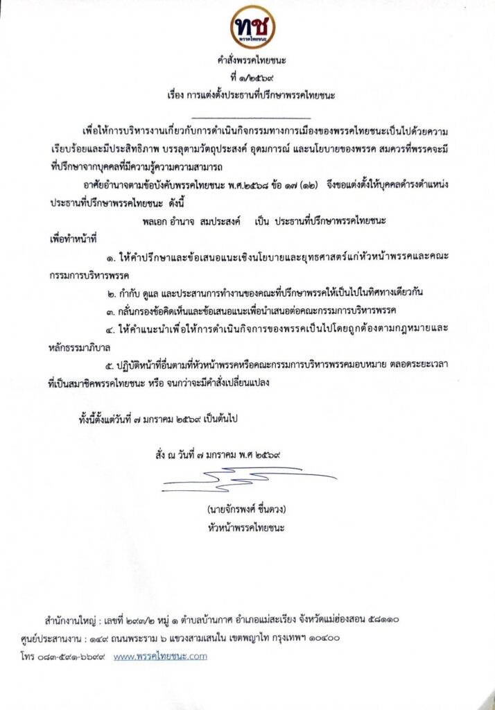 เมื่อวันที่ 7 มกราคม 2569 พรรคไทยชนะ หมายเลข 17 เดินหน้าปรับทัพรับศึกเลือกตั้งสมาชิกสภาผู้แทนราษฎร วันที่ 8 กุมภาพันธ์ 2569 โดยถือฤกษ์ดีต้อนรับปีใหม่ นายจักรพงศ์ ชื่นดวง หัวหน้าพรรคไทยชนะ เปิดเผยว่า ที่ประชุมคณะกรรมการบริหารพรรคมีมติแต่งตั้ง พลเอกอำนาจ สมประสงค์ นายทหารผู้มีประสบการณ์และเครือข่ายทางการเมืองกว้างขวาง เข้ารับตำแหน่ง ประธานที่ปรึกษาพรรคไทยชนะ เพื่อร่วมขับเคลื่อนพรรคสู่การเป็นพรรคการเมืองที่ยึดมั่นในความสุจริต โปร่งใส และหลักธรรมาภิบาล