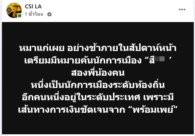 นอกจากนี้ เพจ CSI LA ยังโพสต์ข้อความอีกว่า “หมาแก่เผย อย่างช้าภายในสัปดาห์หน้า เตรียมมีหมายค้นนักการเมือง ‘สี…’ สองพี่น้อง คนหนึ่งเป็นนักการเมืองระดับท้องถิ่น อีกคนหนึ่งอยู่ในระดับประเทศ เพราะมีเส้นทางการเงินชัดเจนจากพร้อมเพย์”