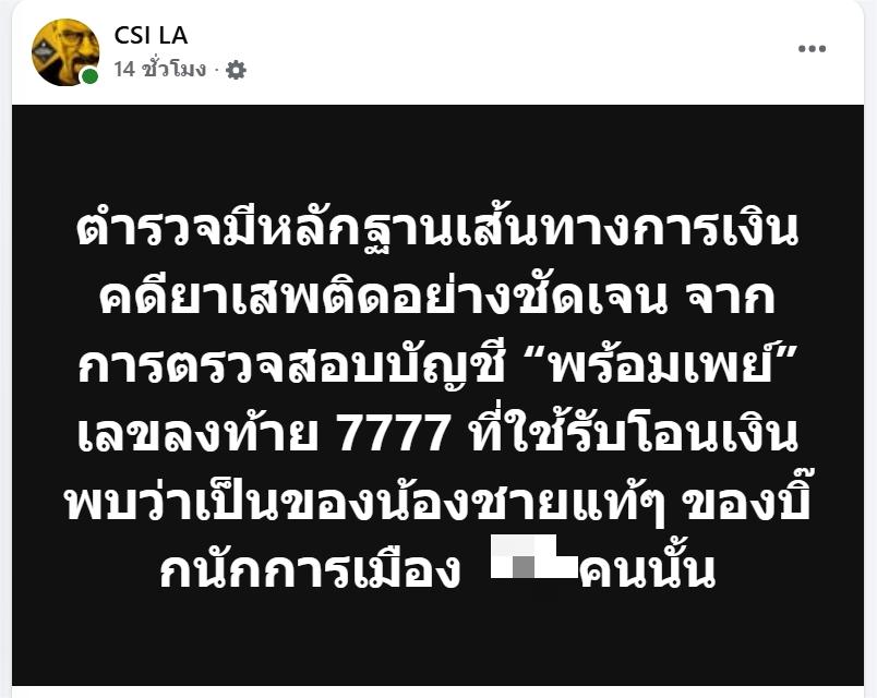 พร้อมระบุว่า “ตำรวจมีหลักฐานเส้นทางการเงินคดียาเสพติดอย่างชัดเจน จากการตรวจสอบบัญชี ‘พร้อมเพย์’ เลขลงท้าย 7777 ที่ใช้รับโอนเงิน พบว่าเป็นของน้องชายแท้ ๆ ของบิ๊กนักการเมืองคนนั้น” และจากการตรวจสอบพบว่าเป็นเบอร์โทรศัพท์ของ สจ.คนดัง ซึ่งเป็นน้องชายของบิ๊กการเมืองคนดังกล่าวจริง
