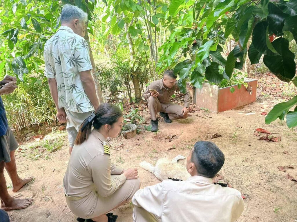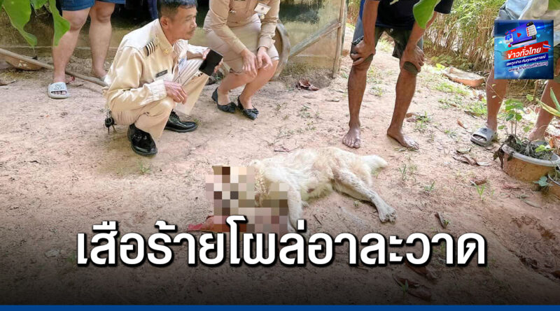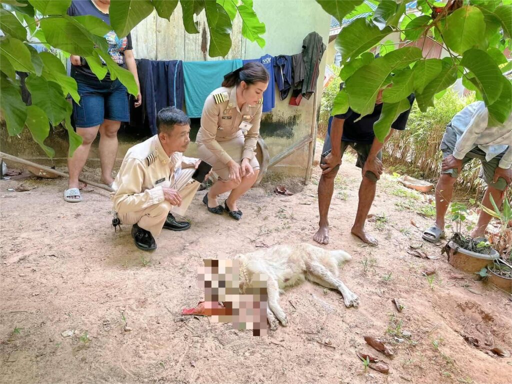 ที่เกิดเหตุพบซาก สุนัขสีขาวพันธุ์ผสม ขนาดใหญ่ นอนตายอยู่ข้างบ้านหลังหนึ่งซึ่งติดกับแนวป่าละเมาะ สภาพศพถูกกัดขย้ำอย่างรุนแรง บริเวณศีรษะพบรอยเขี้ยวขนาดใหญ่ทะลุกะโหลกแตกยุบ และมีรอยเขี้ยวตามลำตัวหลายแห่ง ขณะเดียวกัน บริเวณพื้นดินโดยรอบยังพบ รอยเท้าสัตว์ป่าขนาดใหญ่ อย่างชัดเจน