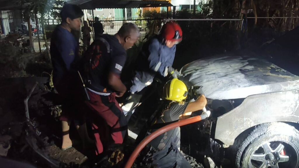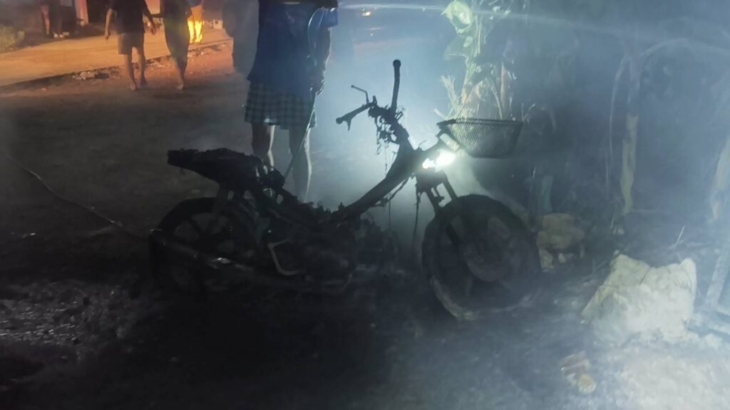 ที่เกิดเหตุพบรถจักรยานยนต์ยี่ห้อ Wave 110i สีน้ำเงิน-ดำ ถูกเพลิงเผาไหม้เสียหายทั้งคันเหลือเพียงโครง ใกล้กันพบรถยนต์ยี่ห้อ Chevrolet สีน้ำเงิน ถูกเพลิงไหม้บริเวณด้านหน้า เจ้าหน้าที่ระดมฉีดน้ำสกัดเพลิงไม่ให้ลุกลามไปยังบ้านเรือนข้างเคียง ใช้เวลากว่า 10 นาทีจึงควบคุมเพลิงไว้ได้