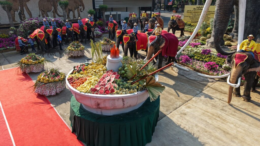 โดยได้รับเกียรติจาก นายอดิเรก อุ่นโอสถ รองผู้ว่าราชการจังหวัดชลบุรี เป็นประธานภายในงานมีการจัดขบวนแห่อย่างยิ่งใหญ่ ประกอบด้วยนักแสดงและช้างแสนรู้จำนวนกว่า 60 เชือก สร้างความตื่นตาตื่นใจให้กับนักท่องเที่ยวทั้งชาวไทยและต่างชาติที่เข้าร่วมงาน ไฮไลท์สำคัญของงาน คือ การตัดริบบิ้นเปิดงานให้น้องช้างทานบุฟเฟ่ต์ “หมาล่าหม้อไฟผลไม้ยักษ์” ขนาดกว้าง 4 เมตร สูง3.5เมตร ซึ่งอัดแน่นด้วยผลไม้นานาชนิดสำหรับเลี้ยงช้าง สะท้อนถึงความอุดมสมบูรณ์และการดูแลเอาใจใส่ช้างอย่างดีของสวนนงนุชพัทยา สำหรับวันที่ 13 มีนาคมของทุกปี ได้รับการกำหนดให้เป็น “วันช้างไทย” เพื่อยกย่องช้าง ซึ่งเป็นสัตว์คู่บ้านคู่เมืองของประเทศไทยมาอย่างยาวนาน อีกทั้งยังเป็นสัตว์คู่พระบารมีของพระมหากษัตริย์ไทย และในอดีตยังเคยเป็นสัญลักษณ์สำคัญบนผืนธงชาติไทย