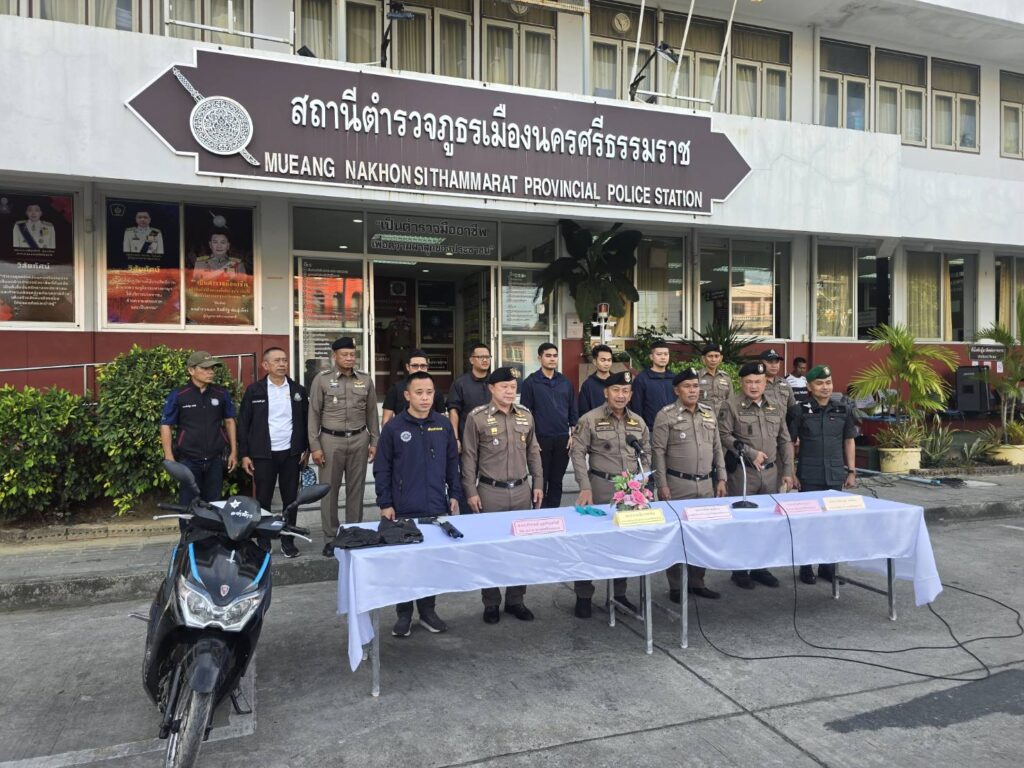 จากกรณีคนร้าย จำนวน 2 คน ใช้อาวุธปืน ยิง นายณาธาร พุทชั่ง อายุ 20 ปี เสียชีวิต เหตุเกิดบริเวณหน้าบ้านไม่มีเลข ซอยปากคู ต.ท่าวัง อ.เมือง จ.นครศรีธรรมราช ทางญาติ ๆ ยืนยันปกตินายณาธาน ผู้เสียชีวิตเป็นคนนิสัยดี กตัญญู เรียบร้อย เป็นที่รักใคร่ของเพื่อนๆ และญาติ ไม่ทราบสาเหตุที่แน่ชัด ตำรวจอยู่ระหว่างสืบสวนสอบสวนและรวบรวมพยานหลักฐาน เพื่อล่าตัวคนร้ายรายนี้มาดำเนินคดีอย่างโดยเร็ว เหตุเกิดเมื่อเวลาประมาณ 03.10 น. วันที่ 31 มีนาคม 2569 ที่ผ่านมา ความคืบหน้าเมื่อเวลา 18.30 น.วันที่ 1 เม.ย.2569 ที่ลานหน้า สภ.เมือง จ.นครศรีธรรมราช พล.ต.ต.พรชัย ขจรกลิ่น รองผู้บัญชาการตำรวจภูธรภาค 8 พร้อมด้วย พ.ต.อ.จักรวรรดิ บุญทวีกุลสวัสดิ์ พ.ต.อ.ขจิต คงปราบ รอง ผบก.ภ.จว.นครศรีธรรมราช พ.ต.อ.กิตตชัย ไกรนรา ผกก.สภ.เมือง จ.นครศรีธรรมราช พ.ต.อ.ดร.ธีระวุฒิ เทพเลื่อน ผกก.สส.บก.ภ.จว.นครศรีธรรมราช พ.ต.อ.นิติกรณ์ ระวัง ผกก.สืบสวน 2 บก.สส.ภาค 8 ร่วมกันแถลงข่าวการจับกุมนายสราวุธ หงษ์ทอง หรือ “บอย ท่าโพธิ์” อายุ 37 ปี ขาใหญ่ในพื้นที่มือปืนโหดผู้ก่อเหตุรัวปืนลูกซอง 5 นัดถล่มนายณาธาร ผู้ตาย ได้ภายในเวลา 24 ชม. โดยนายสราวุธ“บอย ท่าโพธิ์” มือปืนได้หลบหนีขึ้นไปซ่อนตัวในป่ามังคุดบนภูเขา อ.ลานสกา จับกุมพร้อมยึดอาวุธปืนลูกซองยาว 5 นัด และรถจักรยานยนต์ ยีห้อฮอนด้า รุ่นมูฟ สีดำ ไม่ติดแผ่นป้ายทะเบียน ที่ขับหลบหนีในวันเกิดเหตุ ทั้งนี้หลังจากเกิดเหตุเจ้าหน้าที่ตำรวจทั้งชุดสืบสวนสอบสวน ชุดป้องกันปราบปราม สภ.เมือง ชุดสืบสวน บก.สส.ภ.จว.นครศรีธรรมทราช และชุดสืบสวน ภาค 8 ได้บูรณาการสอบลสวนสืบสวนไล่ล่าติดตามจับกุมอย่างกระชิด หากมีการต่อสู้ขัดขวางเจ้าหน้าที่พร้อมจับตายทันที จนทางญาติๆได้ช่วยประสานนายสราวุธ หรือ“บอย ท่าโพธิ์”ให้ยอมมอบตัวกับเจ้าหน้าที่ตำรวจแต่โดยดี ในขณะที่ชุดสอบสวนได้เร่งสอบสวนและรวบรวมพยานหลักฐานยื่นขออนุมัติหมายจับต่อศาลจังหวัดนครศรีธรรมราช และศาลจังหวัดนครศรีธรรมราชได้อนุมัติหมายจับข้อหา”ร่วมกันฆ่าผู้อื่นโดยเจตนา,ร่วมกันมีอาวุธปืนและเครื่องกระสุนปืน ไว้ในครอบครองโดยไม่ได้รับอนุญาต,ร่วมกันพาอาวุธปืนไปในเมือง หมู่บ้านหรือทางสาธารณะ โดยไม่ได้รับอนุญาต จนนาย สราวุธ หรือ“บอย ท่าโพธิ์”ยินยอมให้เจ้าหน้าที่ตำรวจจับกุมแต่โดยดี ไม่มีการต่อสู้ขัดขวางแต่อย่างใด พล.ต.ต.พรชัย ขจรกลิ่น กล่าวว่า หลังเกิดเหตุตนพร้อมรอง ผบก.ภ.จว.นครศรีธรรมราช ได้ประสานกำลังตำรวจจาก